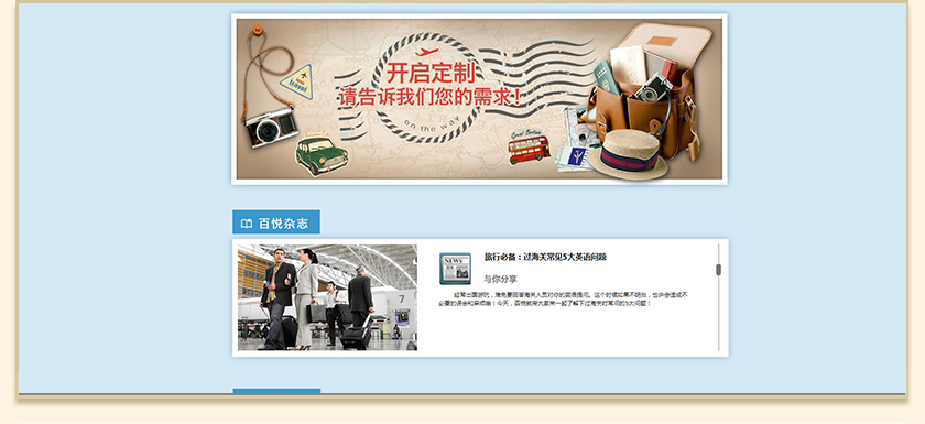 Project Description 百悦逸游于2012年初由二位资深的旅行家创办,是成都传媒集团旗下成都新闻国际旅行社有限公司的高端旅游品牌,总部位于成都高新区天府大道中段美年广场。在百悦逸游成立之前,创始团队亲自到全球三十多个国家实地考察,带着第一手的资讯和执着的信念创立了中国西部第一家真正意义上的私人定制旅行机构。百悦的旅行不是跟团挤大巴,不是十天去十个国家,更不是没完没了的... Official website address 重庆http://www.100.travel I want to share